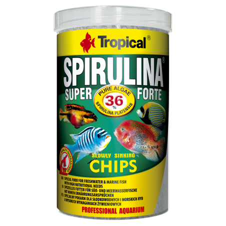 SUPER SPIRULINA FORTE CHIPS chips especiales para peces de agua dulce y salada con altas demandas nuticionales SUPER SPIRULINA FORTE CHIPS son chips que se hunden lentamente con lato contenido (36%) de alga Spirulina platensis. Particularmente recomendado para cíclidos omnívoros y herbóvoros y peces marinos con altas demandas nutricionales. Este alimento está también asequible en otra forma: Super Spirulina Forte, Super Spirulina Forte Granulat, Super Spirulina Forte Mini Granulat, Super Spirulina Forte Micro Granulat, Super Spirulina Forte Mini Sticks, Super Spirulina Forte Tablets