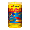 VITALITY & COLOR Un alimento de proteínas en forma de escamas con efecto de activación de color y vitalizante, destinado para la alimentación diaria de los peces carnívoros y omnívoros. Por un alto contenido de proteínas, vitamina E y lecitina se recomienda sobre todo en la temporada del crecimiento y reproducción. Los colorantes naturales: betacaróteno y astaxantina, presentes en el alimento, intensifican los colores de las peces y tienen una favorable influencia en muchos procesos fisiológicos, entre ellos la reproducción, y protegen las células contra la actuación perjudicial de los radicales libres. Para que las peces puedan utilizar con eficacia las grasas que conllevan los alimentos, Vitality & Color está enriquecido en L-carnitina que favorece su metabolismo.