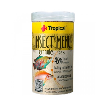 • alimento multicomponente en forma gránulos que se hunden para peces de acuario omnívoros y carnívoros a base de 3 insectos: hermetia (15%), gusano de la seda (15%) y gusano de la harina (15%)