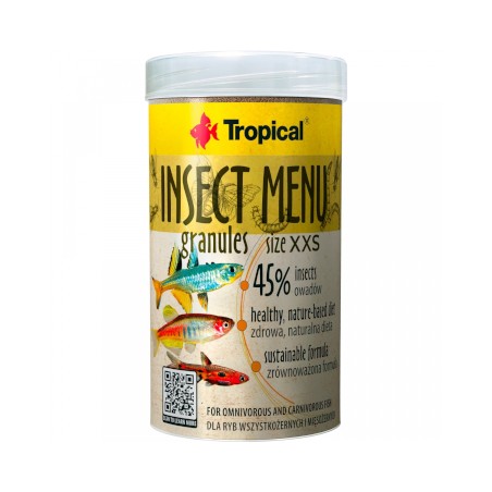 Sobre el producto • alimento multicomponente en forma gránulos muy finos que se hunden para peces de acuario omnívoros y carnívoros a base de 3 insectos: hermetia (15%), gusano de la seda (15%) y gusano de la harina (15%) • contiene únicamente proteína de insecto de alta digestibilidad, rica en aminoácidos esenciales para peces • el alto contenido de grasa, incluyendo ácidos grasos omega-3 y omega-6, es una fuente de energía para los peces y apoya la función de la piel • la proteína de insecto estimula el desarrollo de bacterias de ácido láctico con propiedades probióticas, lo que afecta a una mejor digestión, un crecimiento más rápido y una mayor inmunidad de los peces • el alto contenido de quitina de insecto activa las células inmunes, apoya la flora bacteriana natural de los intestinos y aumenta la absorción de nutrientes • el uso regular del alimento acelera el crecimiento, fortalece la inmunidad, regula la digestión y reduce la carga del acuario con componentes metabólicos • el nivel óptimo de fósforo satisface las necesidades de los peces y reduce la floración de algas • el uso de insectos en el alimento Insect Menu no solo es una referencia a la dieta natural de los peces, sino también una menor presión sobre los recursos ambientales: reducción del consumo de agua y energía y menor huella de carbono • no contiene colorantes ni conservantes